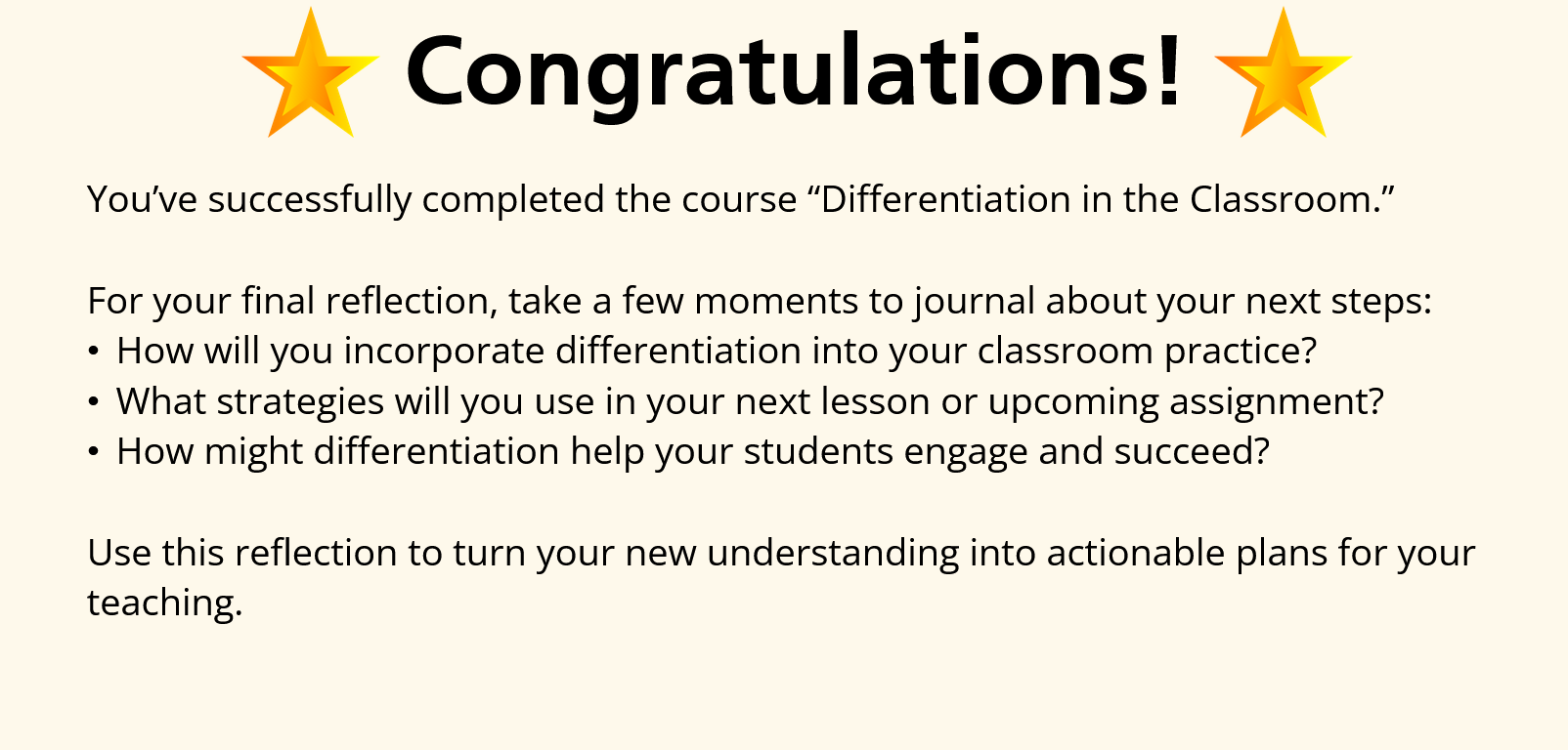 Learners encounter classroom examples and make instructional decisions, receiving targeted feedback to reinforce understanding. Many differentiation strategies are also implemented into the course, such as narration. The course concludes with a quiz and reflective journaling activity to help educators connect the learning to their own practice.
